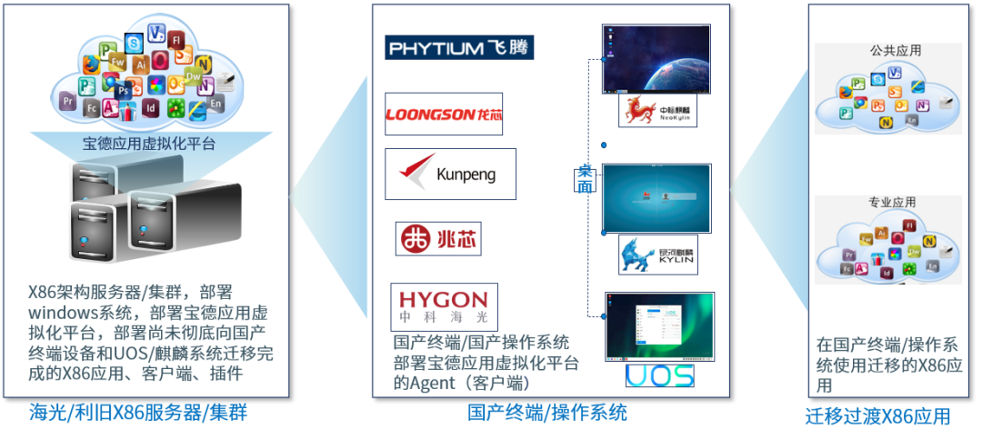 随着业务发展和国产化的需求,该单位采购了一批信创PC用作日常办公,但是应用面临多重阻碍:原本的管理软件无法将这批信创终端纳入管理,网络安全软件需要硬件加密狗的支持而无法完全替换x86环境,现网的部分设备的驱动需要x86环境支撑……该单位迫切需要一个可靠的解决方案,既可以支持全国产化改造期间的办公需求又能够统一管理后续新采购的信创终端。此时,宝德信创桌面云亮剑而出,携手宝德信创应用虚拟化平台,力助客户国产化应用平滑迁移。