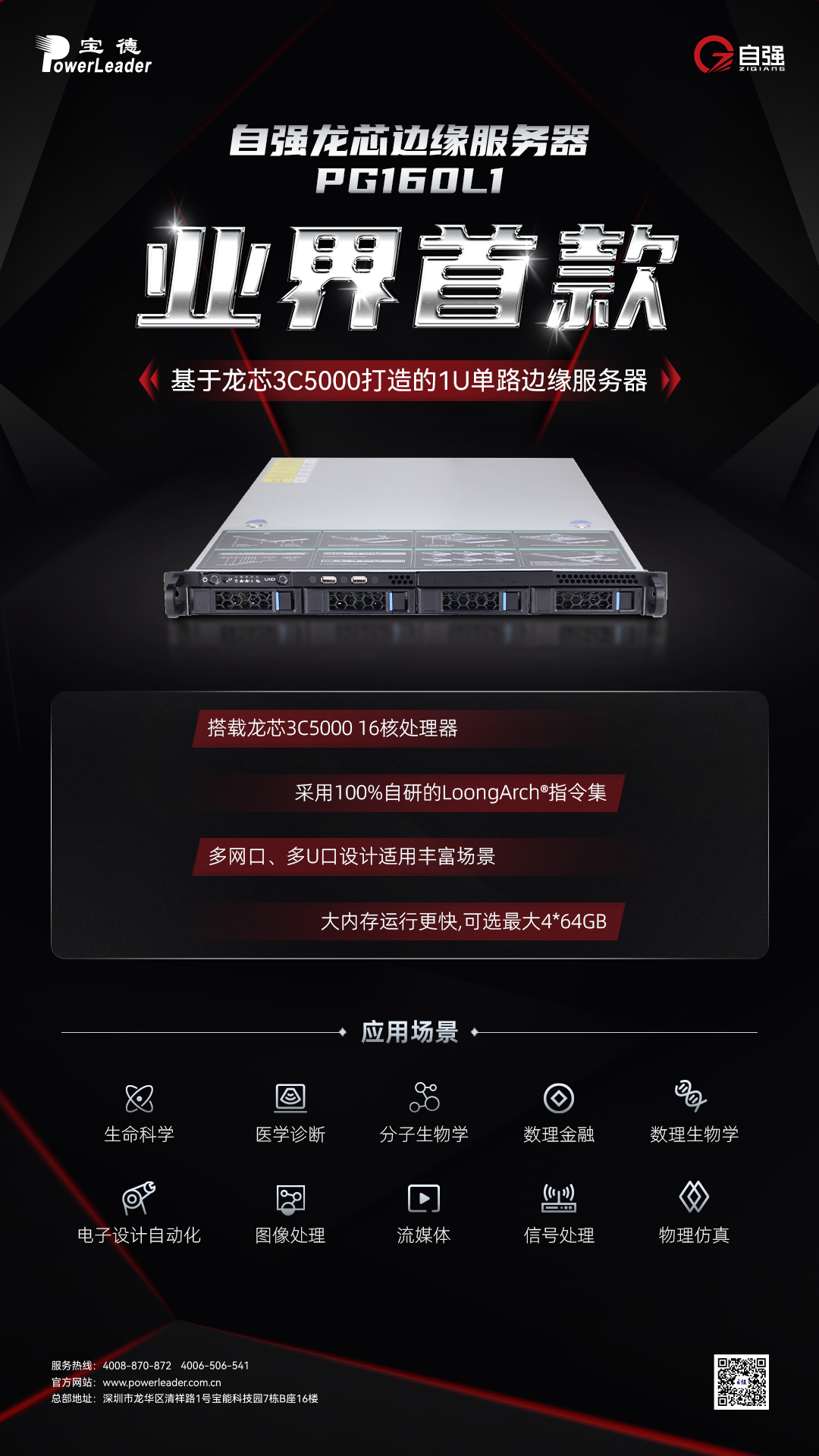 宝德自强® PG160L1,是业界首款基于龙芯3C5000打造的1U单路边缘服务器,采用100%自研的LoongArch ®指令集,得益于3C5000高稳定、高安全性以及良好的性能和丰硕的生态成果,PG160L1可适用于丰富的场景。在外观上,机箱前面板采用全喷砂纹黑,其余钢板本色,整机散热设计优良,可配置1U标准服务器冗余电源,不单外观可人,性能也同样出色。