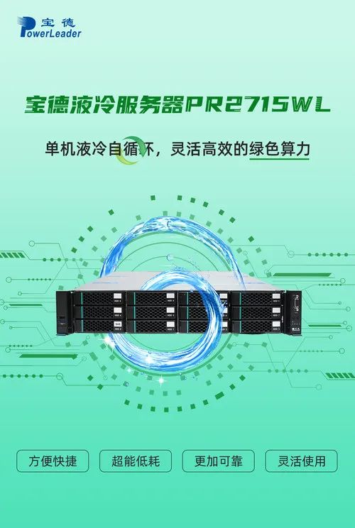 在具体的液冷服务器产品选择方面,针对单机级,宝德提供了液冷服务器PR2715WL/PR2715EL分别采用第三代/第四代英特尔至强可扩展处理器,基于冷板式液冷技术部件级精确制冷、降低制冷成本和提升制冷效率等突出优势,通过风冷+液冷的单机自循环混合散热模式,在降低主要热源CPU所耗电能的同时降低服务器的噪音和增强可靠性,保证了强大计算能力和有效节能降噪。